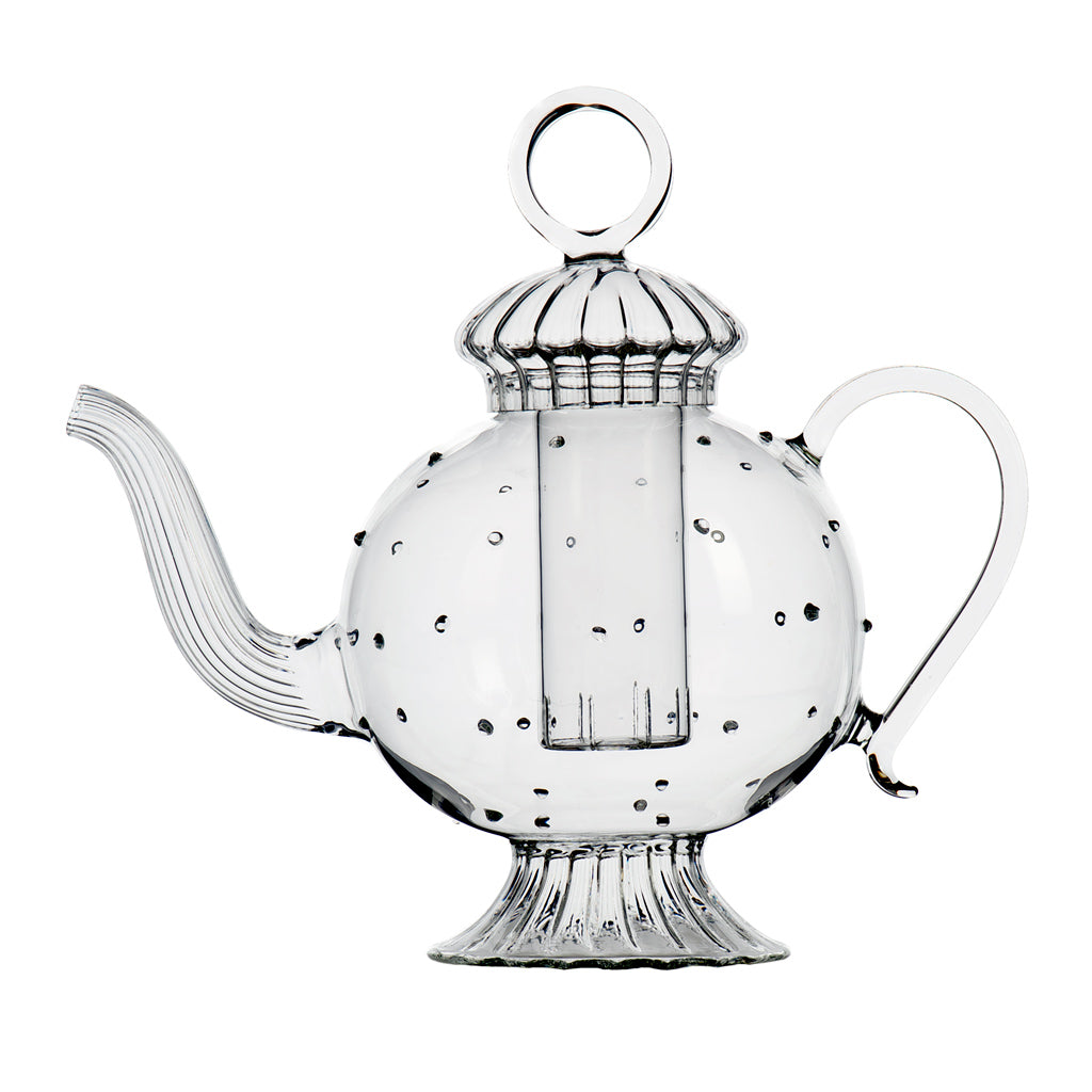 Fiecare element este modelat atent din sticlă borosilicată: un picior și un cioc din sticlă striată pentru echilibru și turnare perfectă, un capac asortat cu tijă circulară și o sită din sticlă pentru frunze de ceai. Mânerul din tijă plată adaugă eleganță și confort la utilizare.